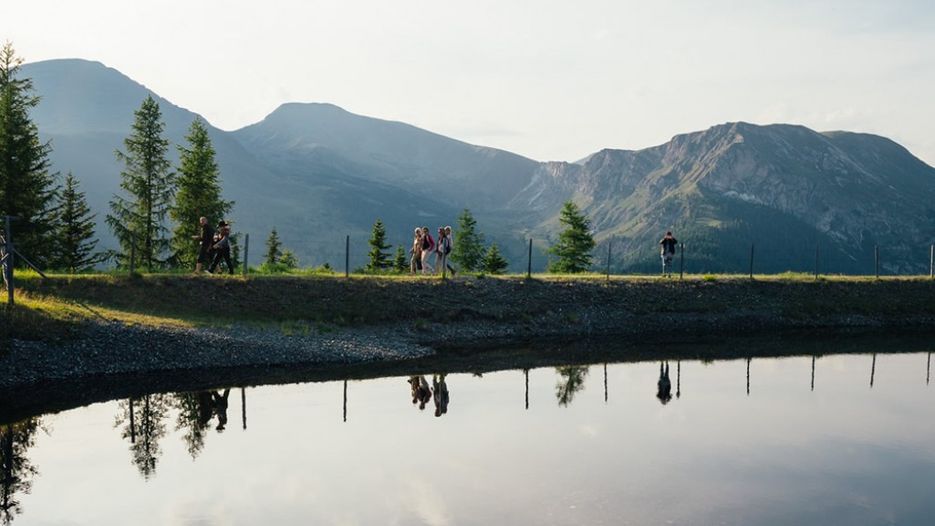 A Brunnach Bioszféra Parki hegyi felvonó állomásánál. Ez az idilli fotóhely mindössze 15 perces felvonózásal elérhető a Brunnach Bioszféra Parki felvonóval. Helyezze magát kényelembe a Nock-IN panorámaétterem napozóteraszán, és élvezze a csillogó hegyi víz látványát. Még pihentetőbb a közvetlenül a víztározó melletti panorámás nyugágyakon, ahonnan fantasztikus kilátás nyílik a Nockberge-hegységre
